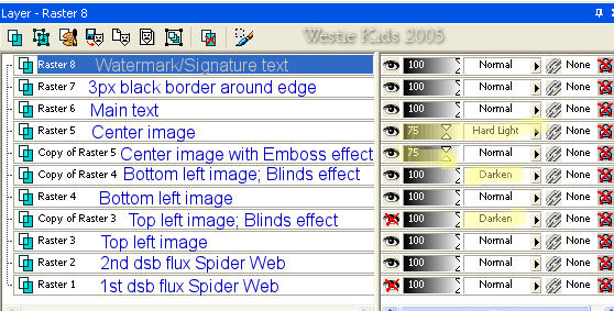 Below are more versions that I did without animating the top left and bottom right images (did not X out the Darken Blend Mode layers, only the Spider Web layers). You could also decide not to animate - just use one gradient layer with the dsb flux Spider Web effect and save your finished file as a .jpg (I like to go to File/Export/JPEG Optimizer with Optimation set to between 15 and 20 for most projects):